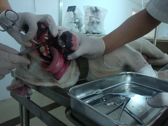今日下午,一只1.5岁的杜宾斗犬来到我院。应主人要求,该犬口内有科牙要拔除。我院医生通过检查、消毒、留置、麻醉、手术、止血、20分钟后,手术完成。