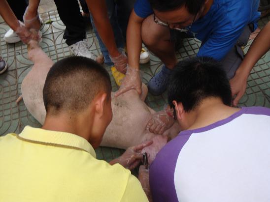 百闻不如一见:我校在全国同类专业学校核心竟争力是技术实用且重在操作,2010年秋季进入我校学习的新生在上课的第二天参观了养殖场后,正式进入了学习和实习状态。图为开学第三天进行猪的实习解剖。接下来的实习之(二)是鸡、鸭、鹅的解剖实习;之(三)为我校绝技:小母猪30秒快速挑花实习和比赛。敬请留意!